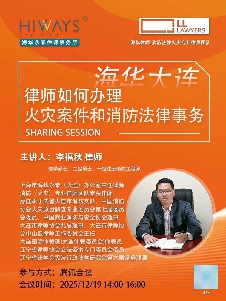 李福秋,男,法学硕士、工程硕士,上海市海华永泰(大连)律师事务所主任律师,微信公众平台“消防法律研究”主编,一级注册消防工程师;中国消防协会火灾原因调查专业委员会七届委员会委员、辽宁省法学会宪法行政法学研究会第六届常务理事、辽宁律协立法咨询专门委员会委员、大连市律师协会九届理事、大连国际仲裁院仲裁员;原大连市公安消防局火调技术科工程师、大连市公安局公职律师,主要从事消防法制、地方立法及火灾事故调查等工作;2017年从大连市公安消防局退役从事律师,带领消防法律团队专业从事消防法律、企业消防安全合规及火灾事故案件处理等工作。