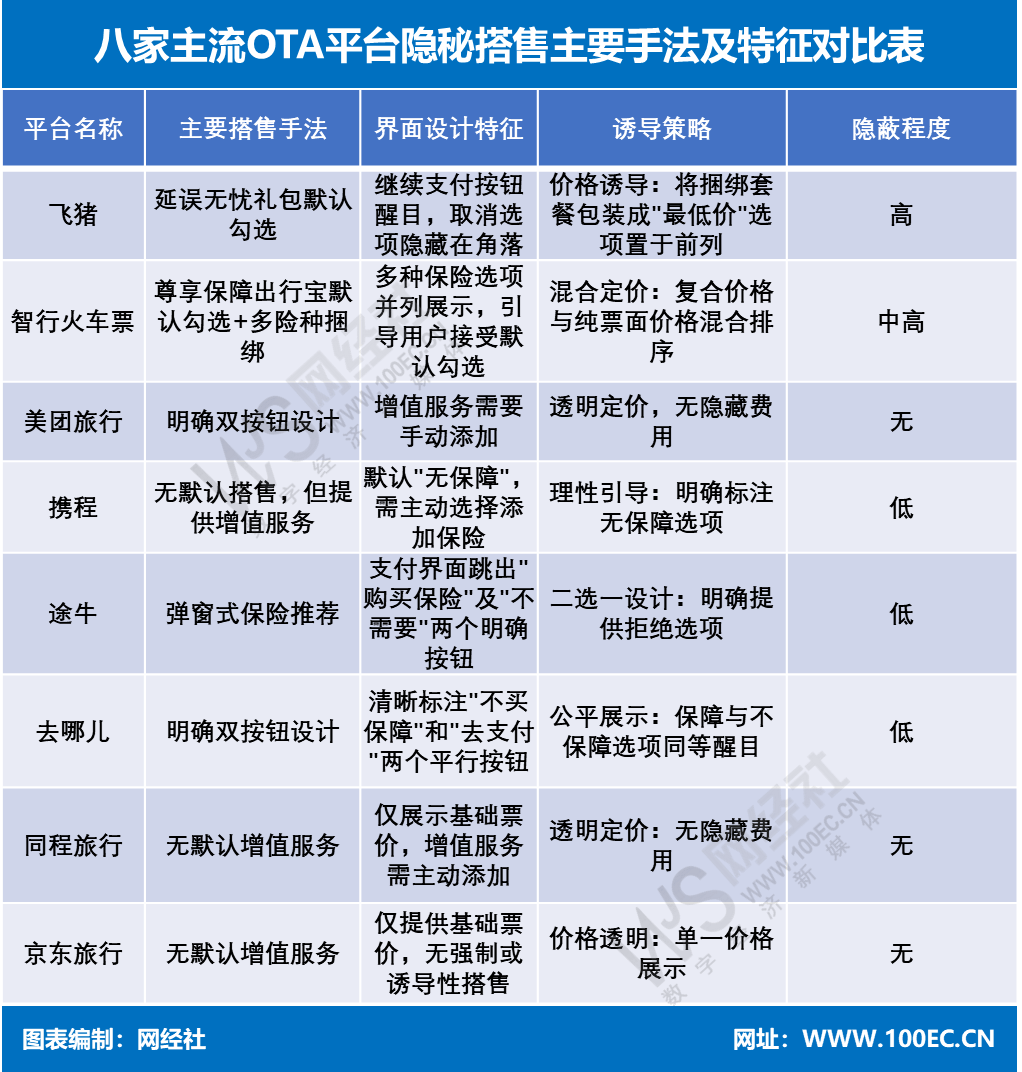 当下OTA平台的搭售策略已从粗暴的默认勾选升级为精细的界面设计,其中最显著的手法是比价陷阱。评测结果显示,多个OTA平台在火车票销售中将捆绑服务的选项包装成最低价置于前列,诱导用户点击。
