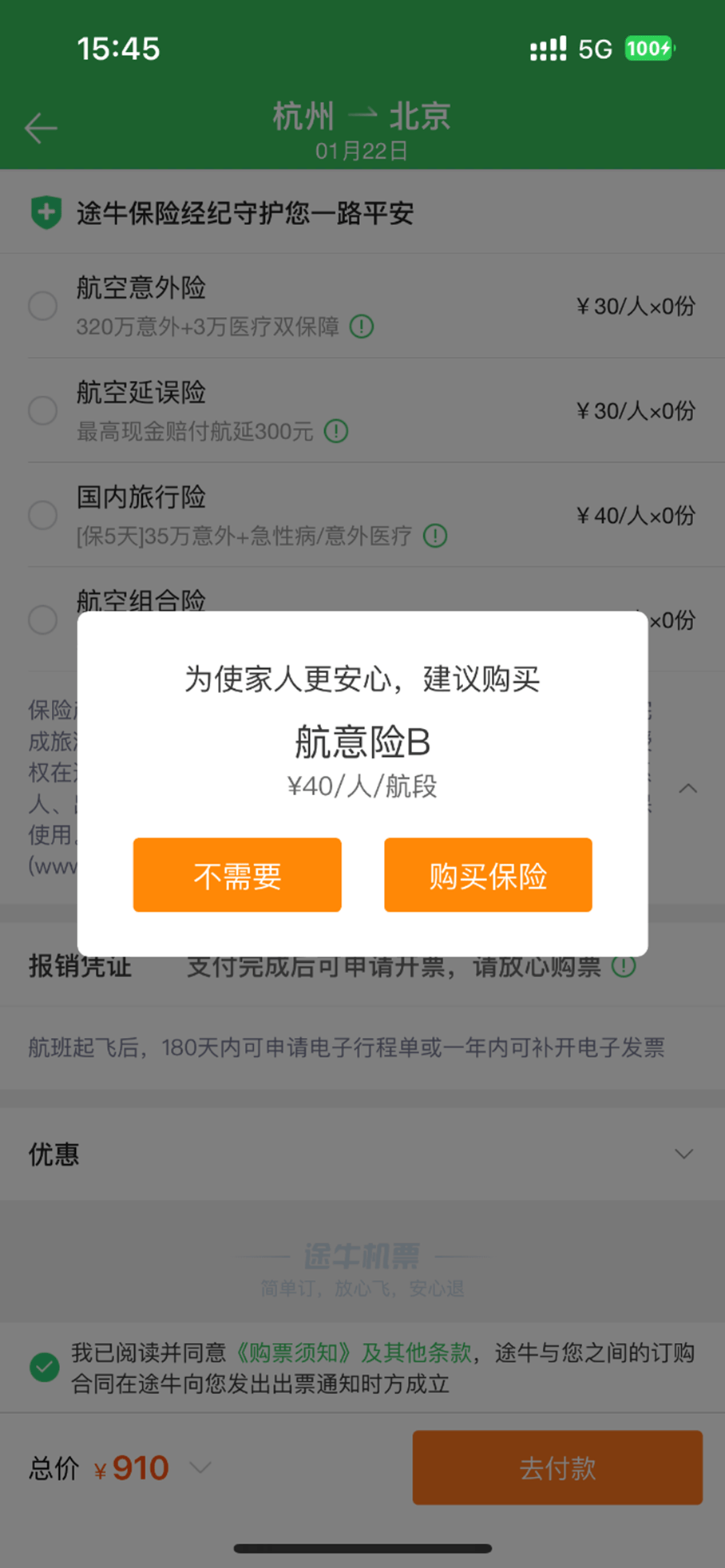 途牛旅游APP和去哪儿旅行APP在保险勾选设计上相对透明。途牛在支付界面跳出“购买保险”及“不需要”的选择按钮,默认总价910元;去哪儿则明确标注“不买保障”和“去支付”两个按钮,默认总价976元。