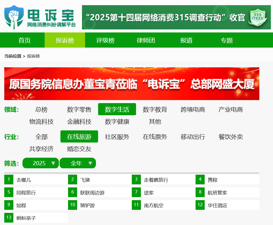 “电诉宝”显示,2025年在线旅游用户投诉按数量排名依次为去哪儿、飞猪、走着瞧旅行、携程、同程旅行、联联周边游、途家、航班管家、如程、骑驴游、南方航空、华住酒店、蝌蚪亲子。