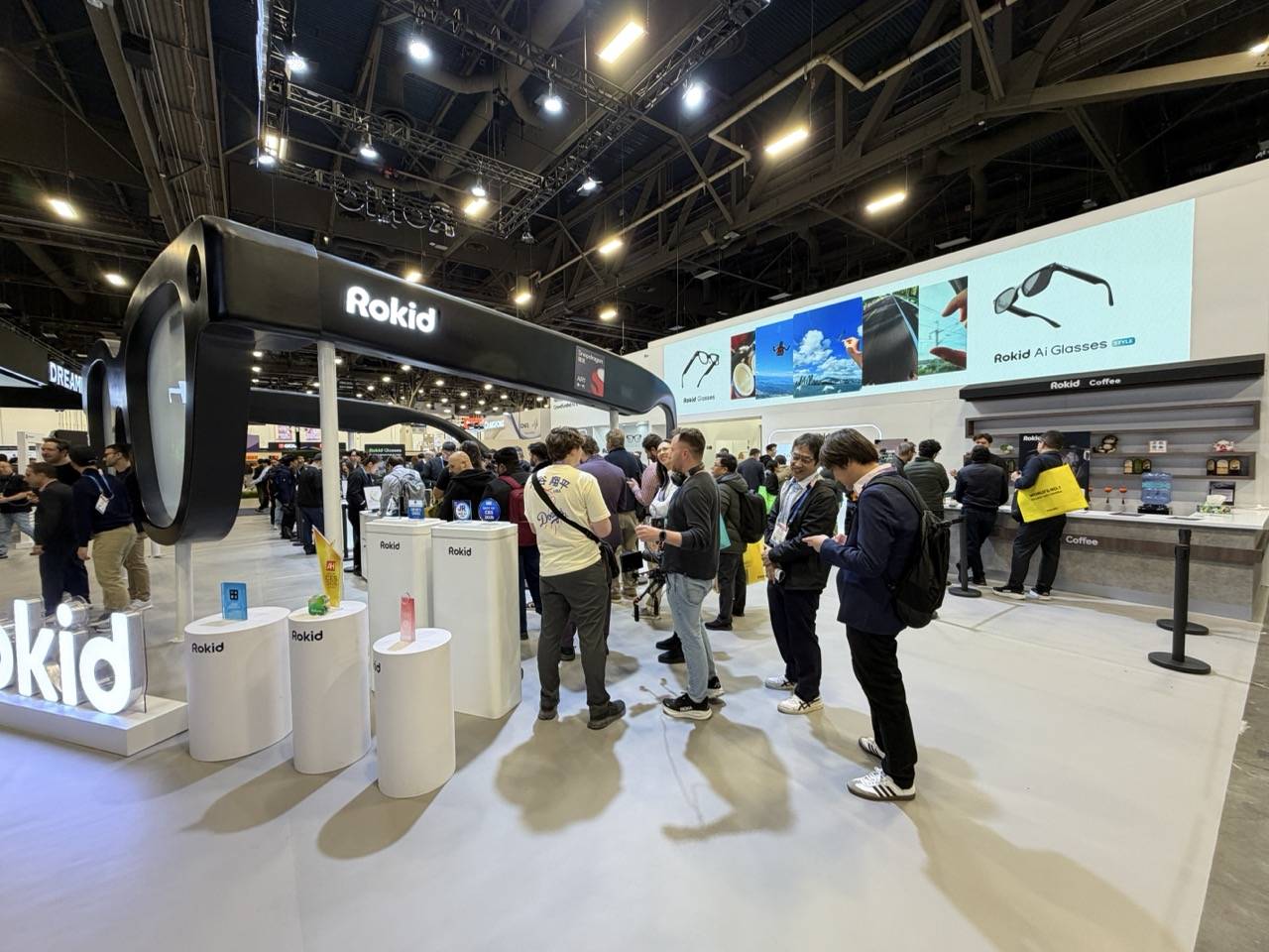不得不提的,依然是前文已经涉及到的中国 AI 眼镜品牌乐奇 Rokid的展台。这家的展台经常排起长龙、人气火爆,主要有三方面原因,其一是展台特别装置的「巨型眼镜」,现在效果来看,颇为吸睛,包括前期的宣传预热;其二是眼镜品类展台的试戴体验,对应到单人本身就比较耗费时间,而这又进一步拉长了人群的排队规模;其三是 Meta 眼镜供货紧张的局面,客观上让乐奇等更多 AI 眼镜品牌可以有「外溢」的受众群体。